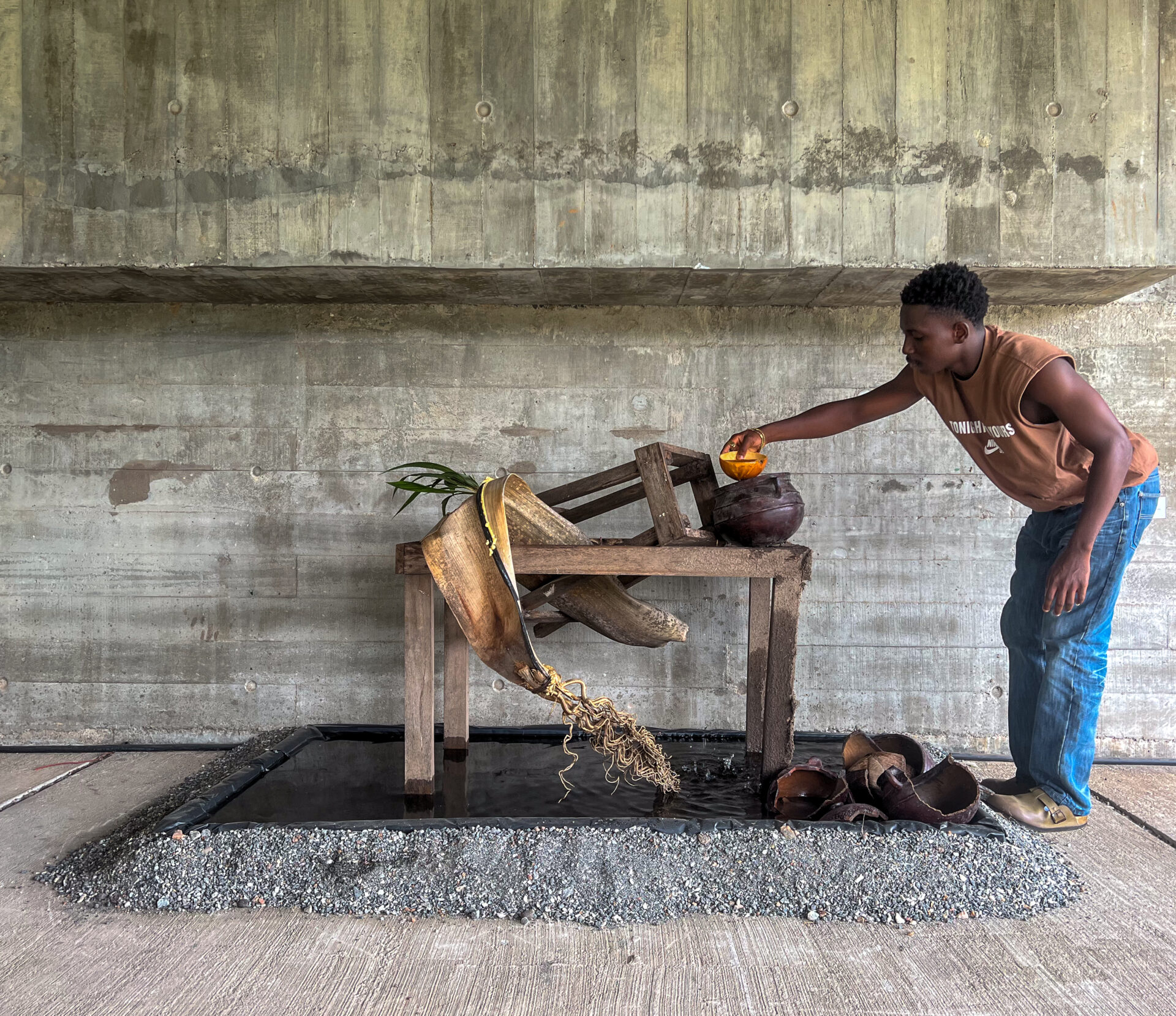 Sümer Erek created Tears of Gold, an installation addressing environmental justice and the colonial extraction of natural resources, using local fibres, kente cloth, and living plants.