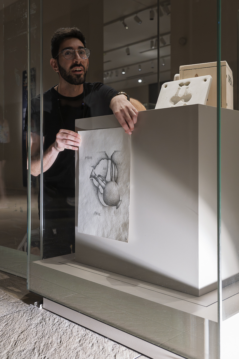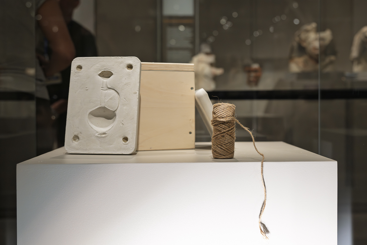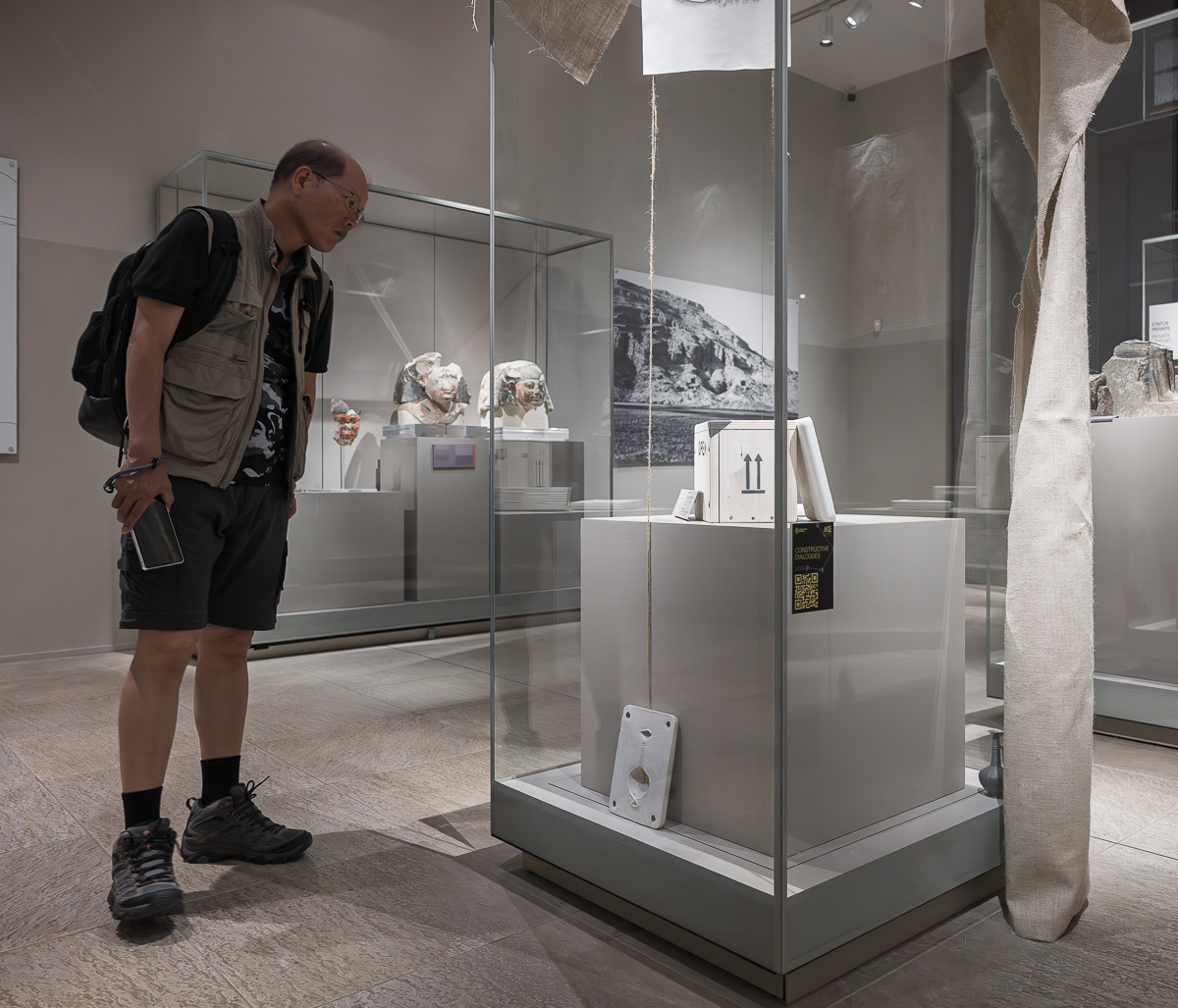 During his residency at Museo Egizio, Nicolas Kyrillou developed Show-Case, an installation reflecting on how museum displays both reveal and conceal meaning. Drawing inspiration from the historical relationship between Egypt and Alashiya (ancient Cyprus), he explored questions of absence, memory, and restitution. Using object moulds, rough textiles, and drawings, Kyrillou created a dialogue between what is shown and what remains hidden, inviting viewers to reflect on ownership and the ethics of display. The work also speaks to Cyprus’s complex colonial history and its enduring connections with Egypt, transforming the showcase into a metaphor for visibility, control, and loss. Installed within the galleries of the Middle Kingdom, Show-Case echoed the themes of decolonisation central to the residency, prompting visitors to consider how institutional narratives shape cultural memory. Kyrillou’s critical gesture revealed the emotional and political layers embedded in museum practices.