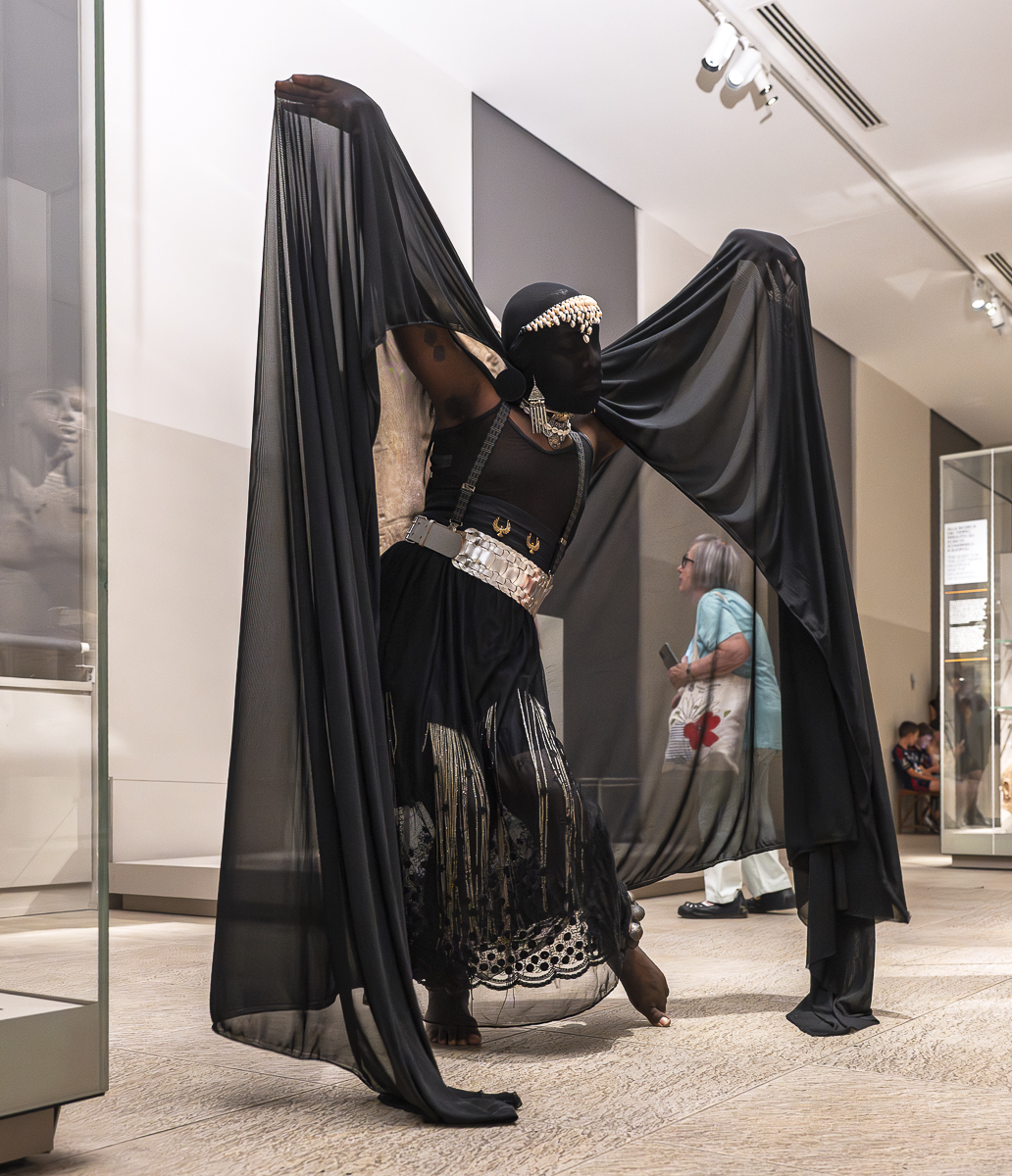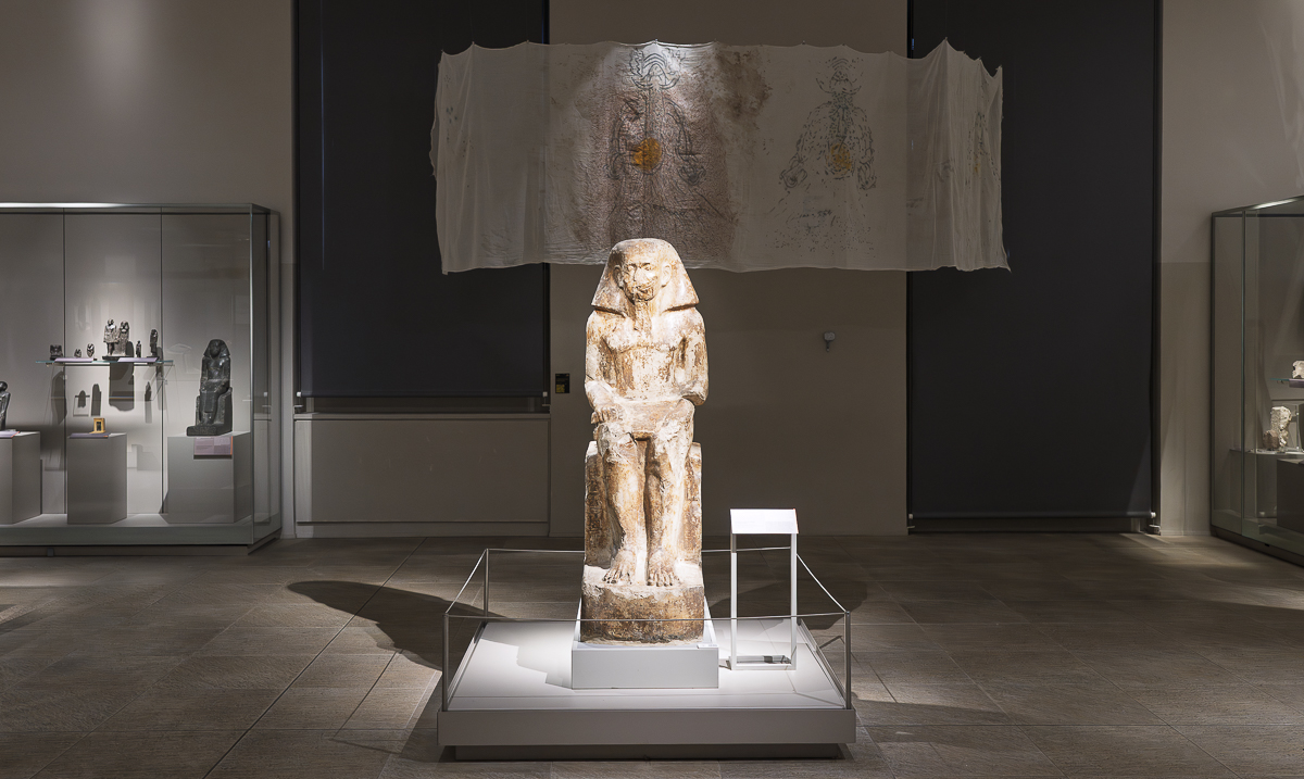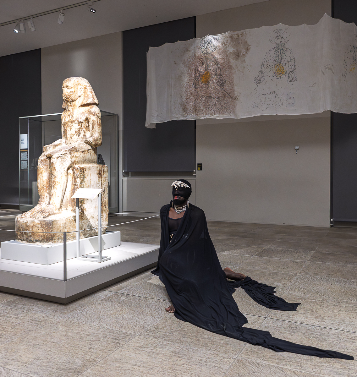 During his residency at Museo Egizio, Patrick Ngabonziza created Breathing Stela, a large-scale hand-painted textile work that reinterprets 19th-century European narratives about Ancient Egypt. Drawing from historical texts by Champollion, Shelley, and Giulio Cordero di San Quintino, the artist explored how early archaeological discourse reflected Europe’s imperial fascination with Egypt. Combining natural pigments—charcoal, indigo, red clay, turmeric, and walnut crystals—with performance, Ngabonziza gave voice to displaced histories and embodied memory. His work questioned the ways monuments and artefacts have been extracted, relocated, and recontextualised, raising critical reflections on power, possession, and historical representation. The performance within the museum created a powerful dialogue between movement and stillness, presence and absence. By reanimating archival voices and situating them within the museum’s colonial legacy, Breathing Stela offered a poignant critique of how history is told—and who gets to tell it.